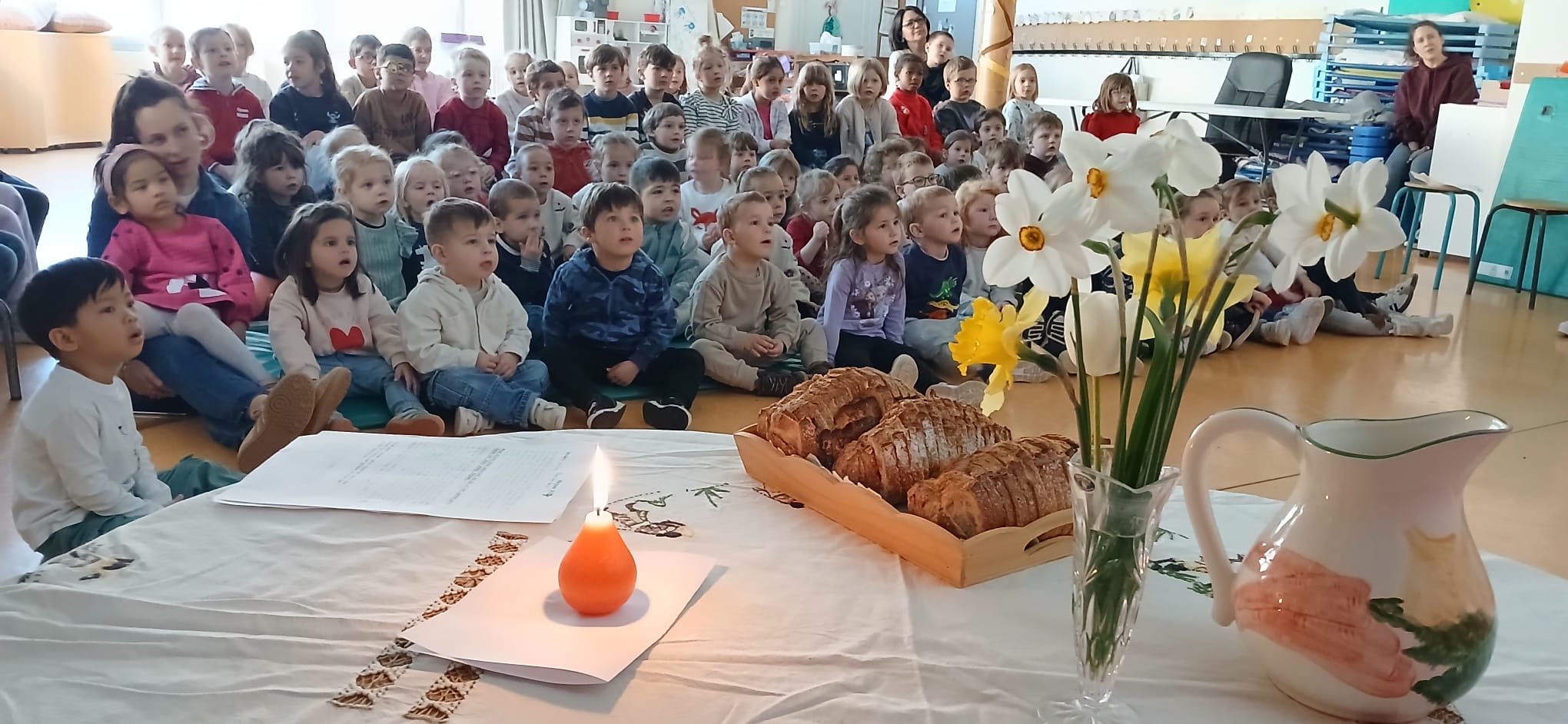 Pour l’occasion, une belle table de fête avait été installée, ornée de symboles forts que les enfants ont pu découvrir et comprendre : le bouquet de fleurs, la bougie, la cruche d’eau et la nappe, autant de signes évoquant le partage, l’accueil et la convivialité.